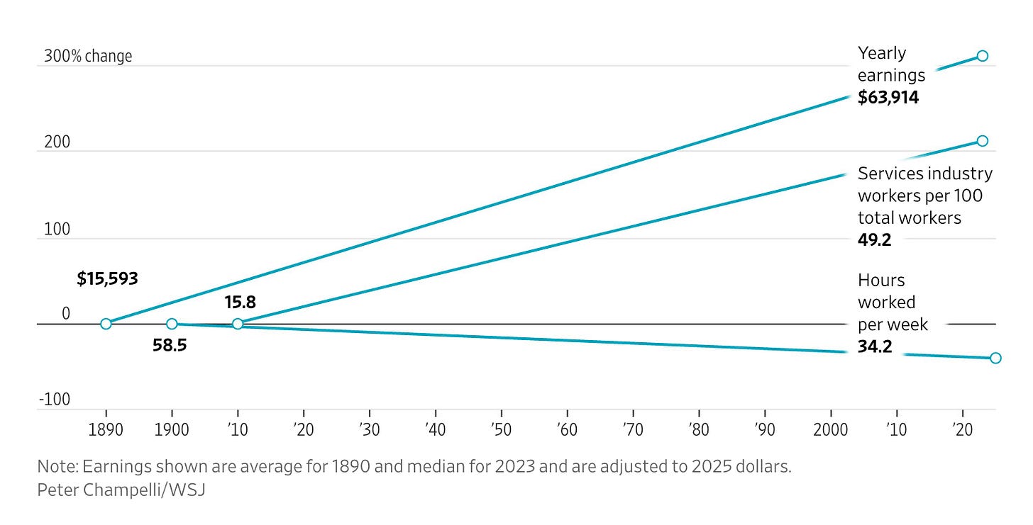 The Wall Street Journal recently published a fascinating set of data visualizations showing how life has changed for the average American worker over the past few centuries. In short, despite all the hand-wringing over our transition out of a manufacturing-dominated economy, the modern worker has a lot to be grateful for.