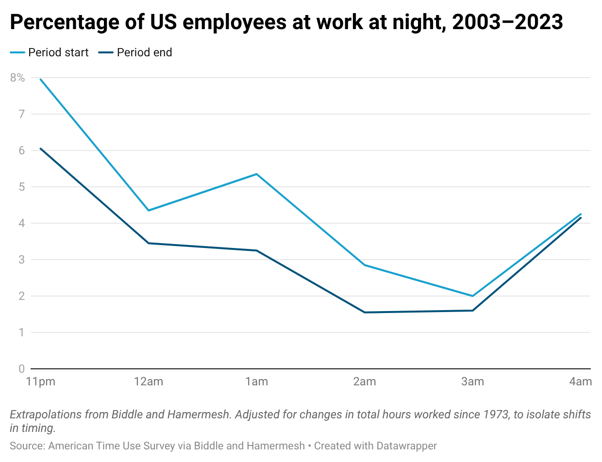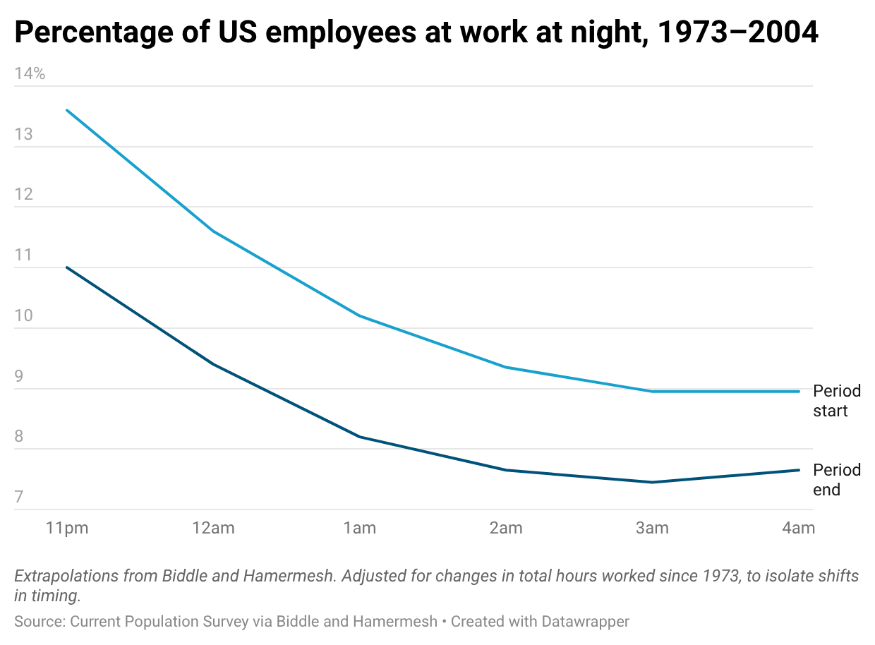 A newly released working paper finds that fewer Americans are taking night shifts. The authors used two different methods to calculate the change between two different periods (see the charts below), with each showing a clear decline in the share of US employees working at night. They argue this shift is due to workers demanding higher wage premiums for night work rather than changes in the relative size of different industries, noting that “the trend exists in all major industries except retail.”