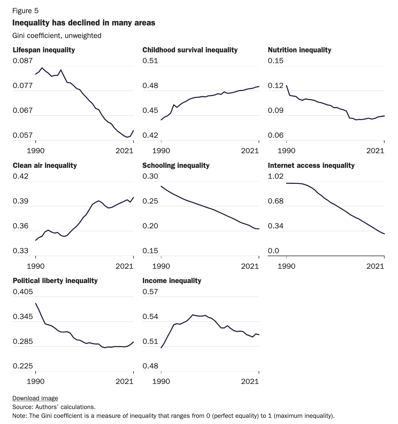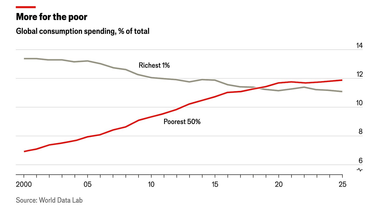 Another analysis published in The Economist finds that global inequality in consumption spending is falling. In 2000, the richest 10 percent of humanity spent 40 times more than the poorest 50 percent. In 2025, they spent around 18 times more.