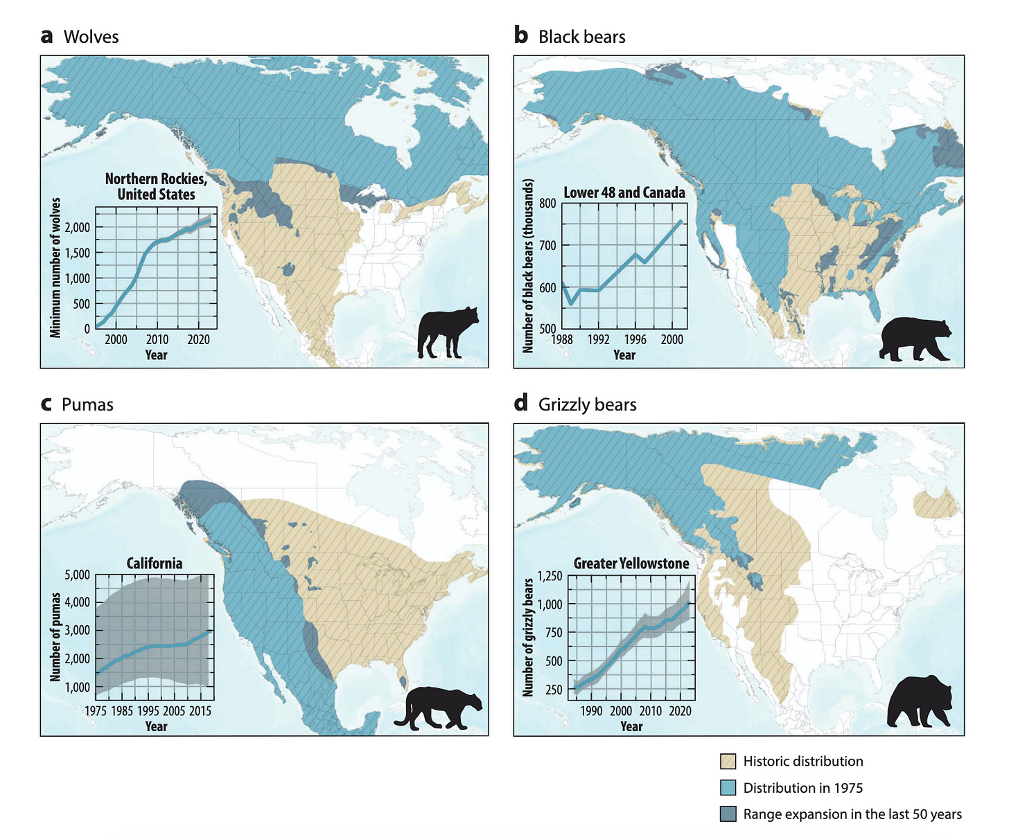 North America’s big four terrestrial carnivores—gray wolves, pumas, black bears, and grizzly bears—have seen a strong recovery in recent decades. All four species have significantly expanded their population and range (see the figure below), though they remain far below historic levels.