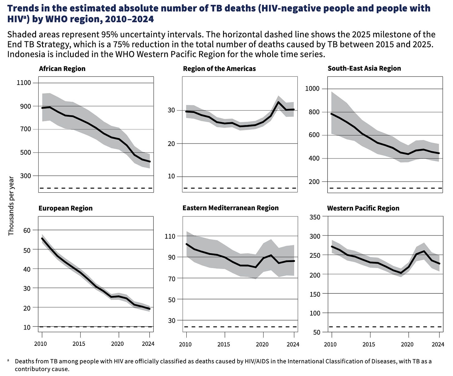 According to the World Health Organization, global tuberculosis deaths fell by over 40 percent between 2010 and 2024, from 2.13 million to 1.23 million. Africa, where a large share of tuberculosis deaths occur, saw particularly rapid progress.