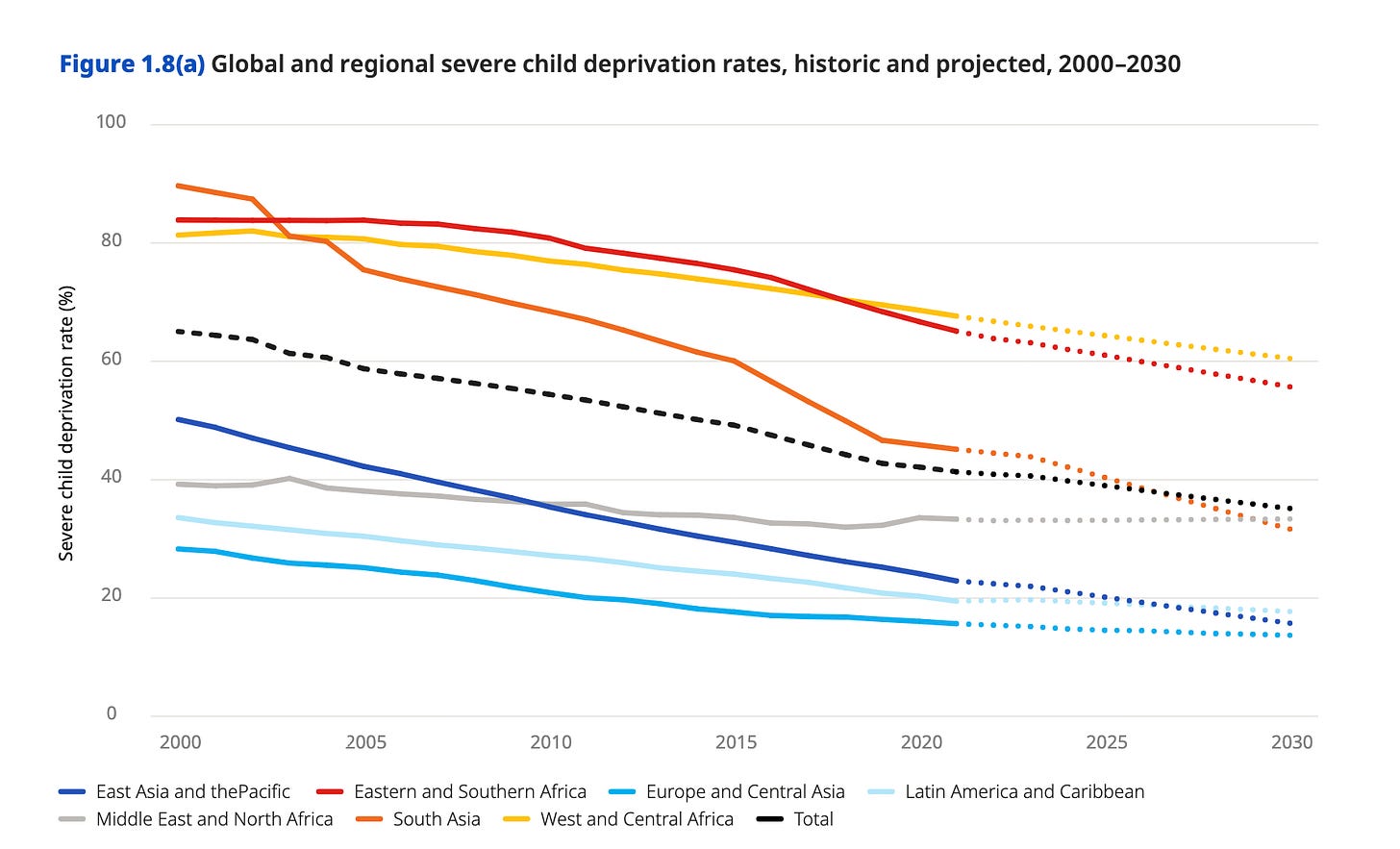 UNICEF’s latest State of the World’s Children report finds that the share of children living in “severe deprivation” fell from 65.1 percent to 40.6 percent between 2000 and 2023. Note that this measure is not based on family income, but instead on indicators related to education, health, housing, nutrition, sanitation, and water.