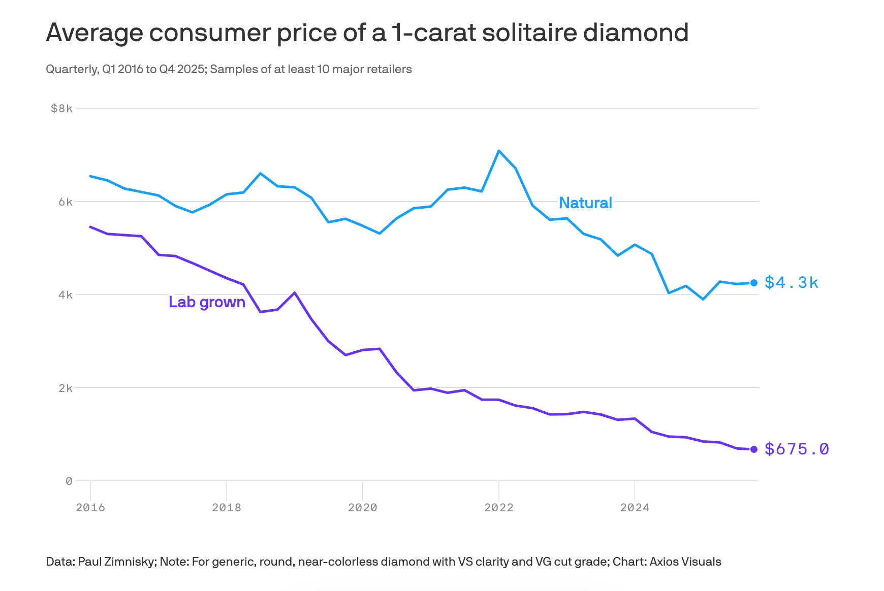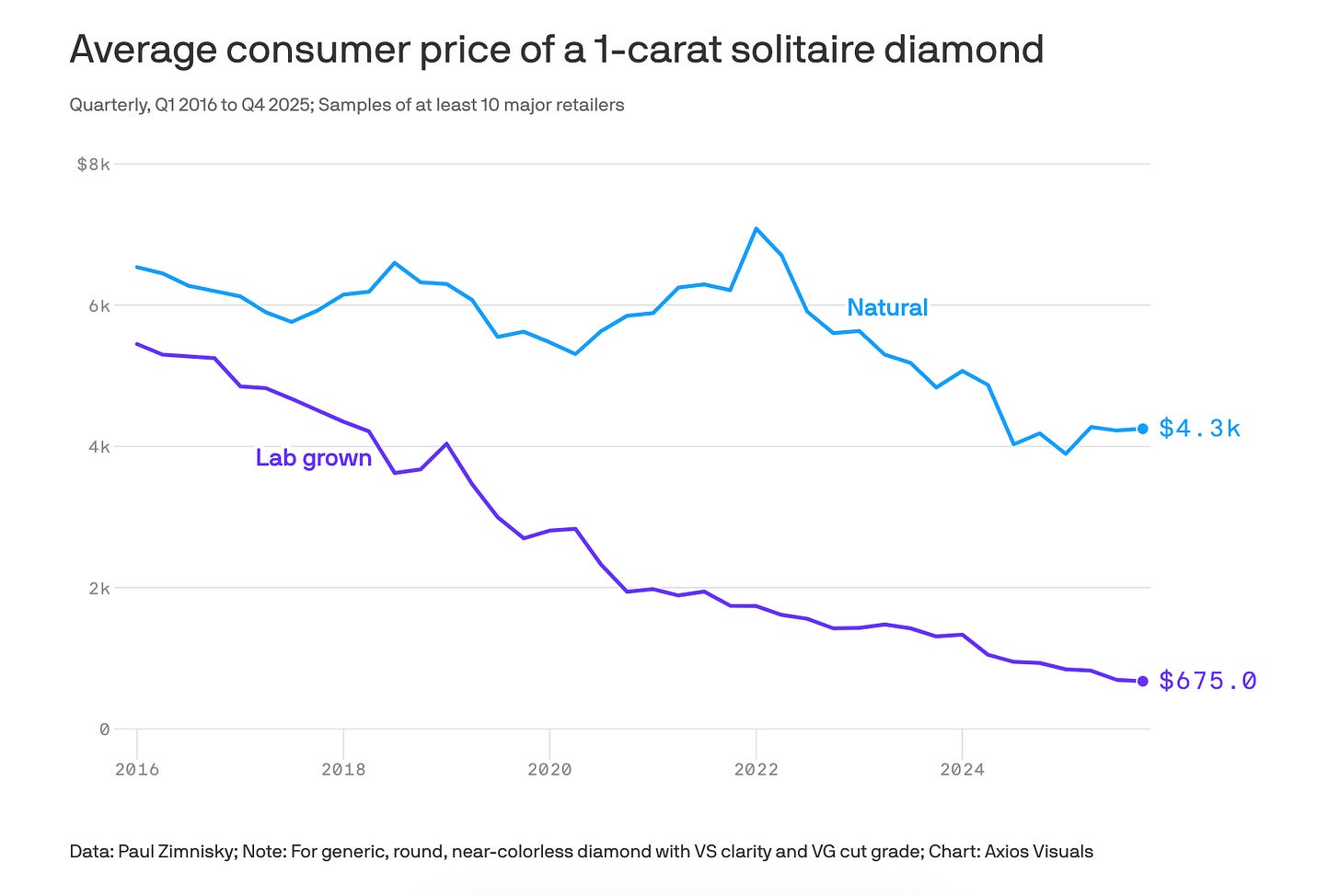 Synthetic diamonds are not only getting cheaper but also driving down prices for their natural counterparts. Consumers are responding by purchasing larger stones.