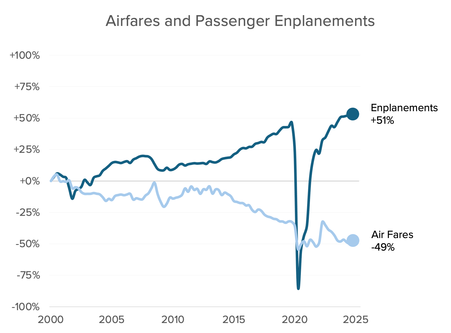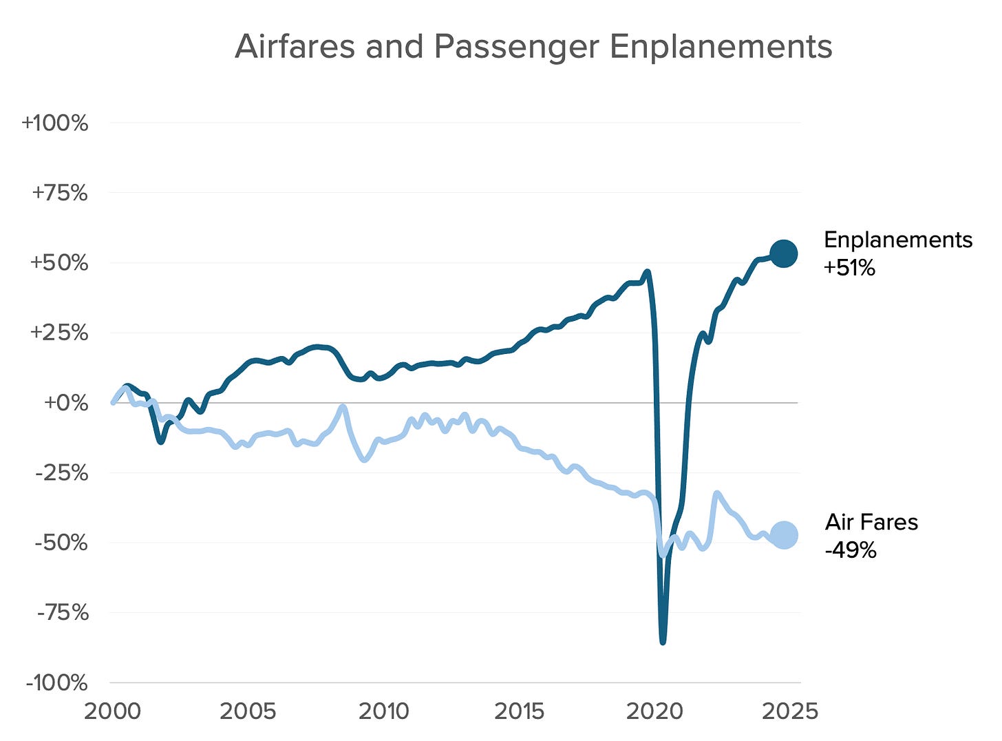 Since 2000, US airfare time prices decreased by 49 percent while passenger enplanements grew by 51 percent.
