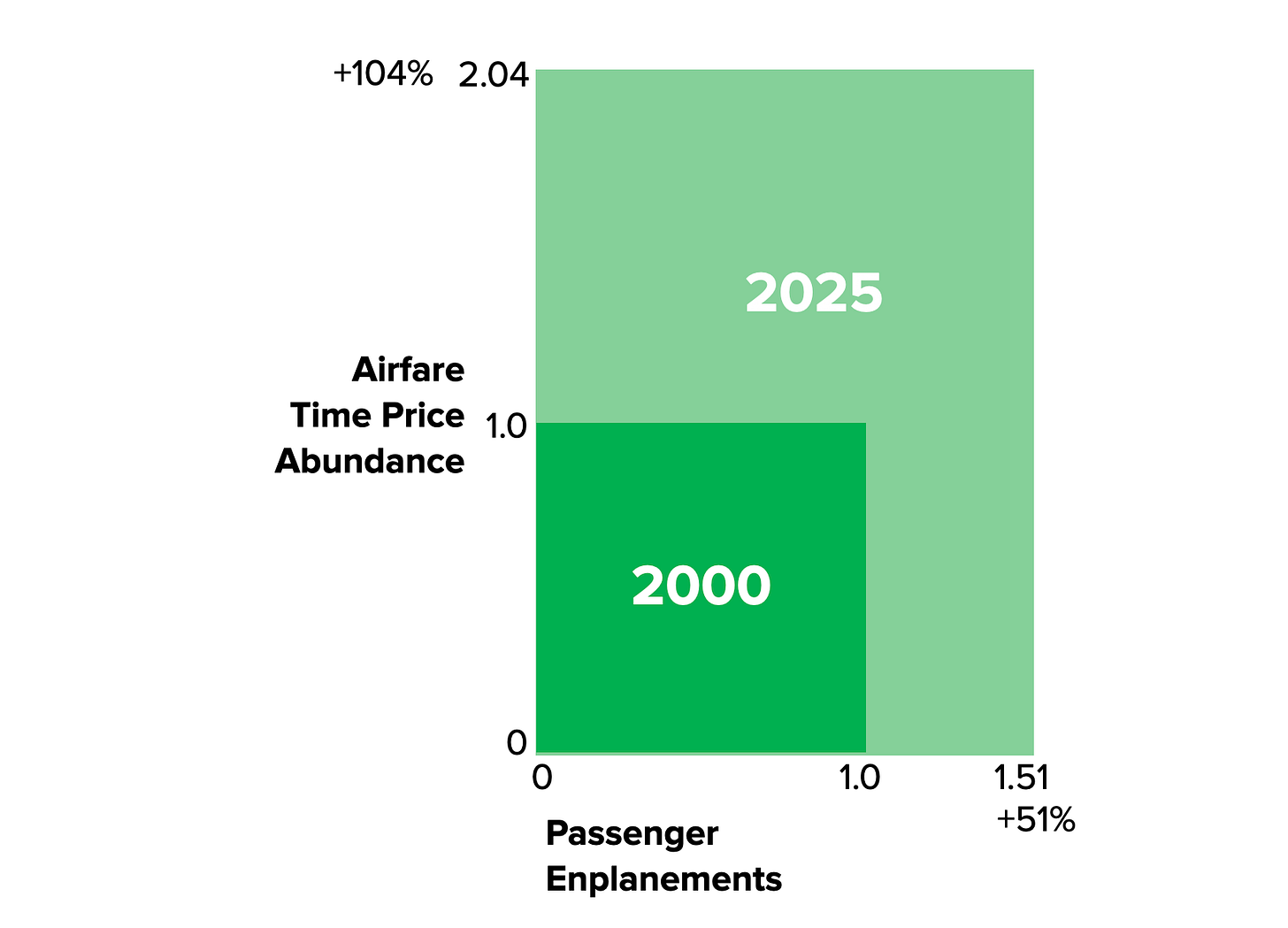 Using 2000 as our baseline (setting both variables to 1.0), the initial box measures 1.0 × 1.0 = 1.0. By 2025, enplanements had grown 51 percent (to 1.51) while airfare abundance increased by 104 percent (to 2.04). The 2025 box therefore measures 1.51 × 2.04 = 3.08.