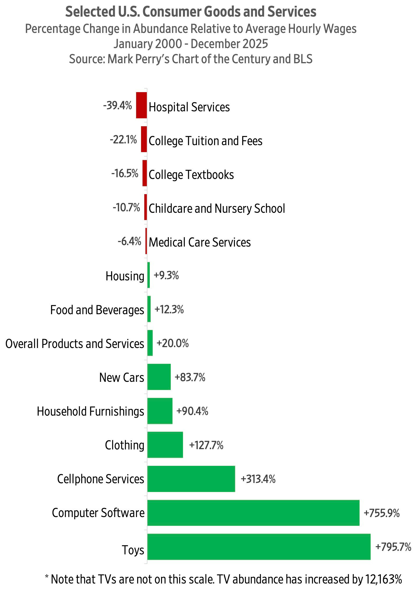 Professor Mark Perry from the American Enterprise Institute recently posted an updated version of his “Chart of the Century,” featuring price and wage data from the Bureau of Labor Statistics (BLS). The chart tracks 14 items over the 25-year period from January 2000 to December 2025. It also includes the overall inflation rate and changes in average hourly wages.