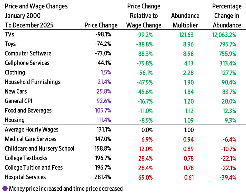 This analysis illustrates that things can become more expensive in dollar terms while simultaneously becoming more affordable in time prices. For instance, while the general Consumer Price Index (CPI) rose by 92.6 percent, average hourly wages increased by 131.1 percent. As such, time prices fell by 16.7 percent. For the time it took to earn enough money to purchase one CPI basket in January 2000, a consumer could purchase 1.2 baskets in December 2025—an abundance increase of 20 percent.