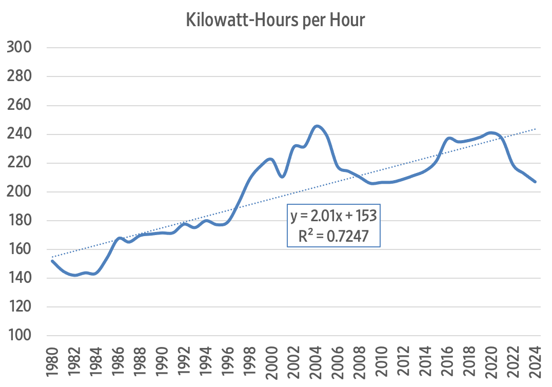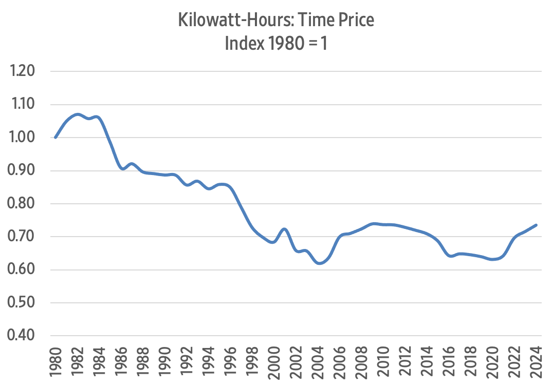 Another way to understand electricity prices is to ask: how many kWh can you buy with one hour of work? This chart illustrates that relationship. In 1980, an hour of US blue-collar labor could buy 152 kWh; today, it buys 207 kWh—a 36 percent increase in energy abundance.
