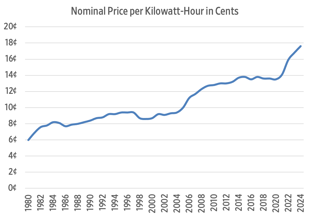 The US Bureau of Labor Statistics (BLS) tracks average electricity prices over time in nominal terms. The chart below shows the U.S. average price per kWh from 1980 to the present—rising from about 6 cents per kWh in 1980 to 17.6 cents today.