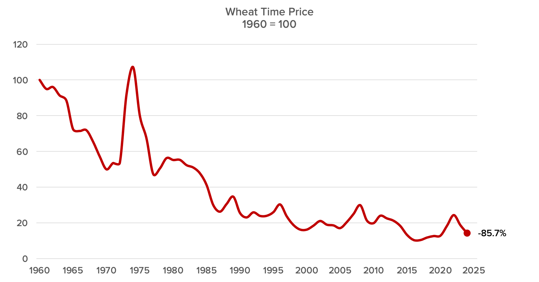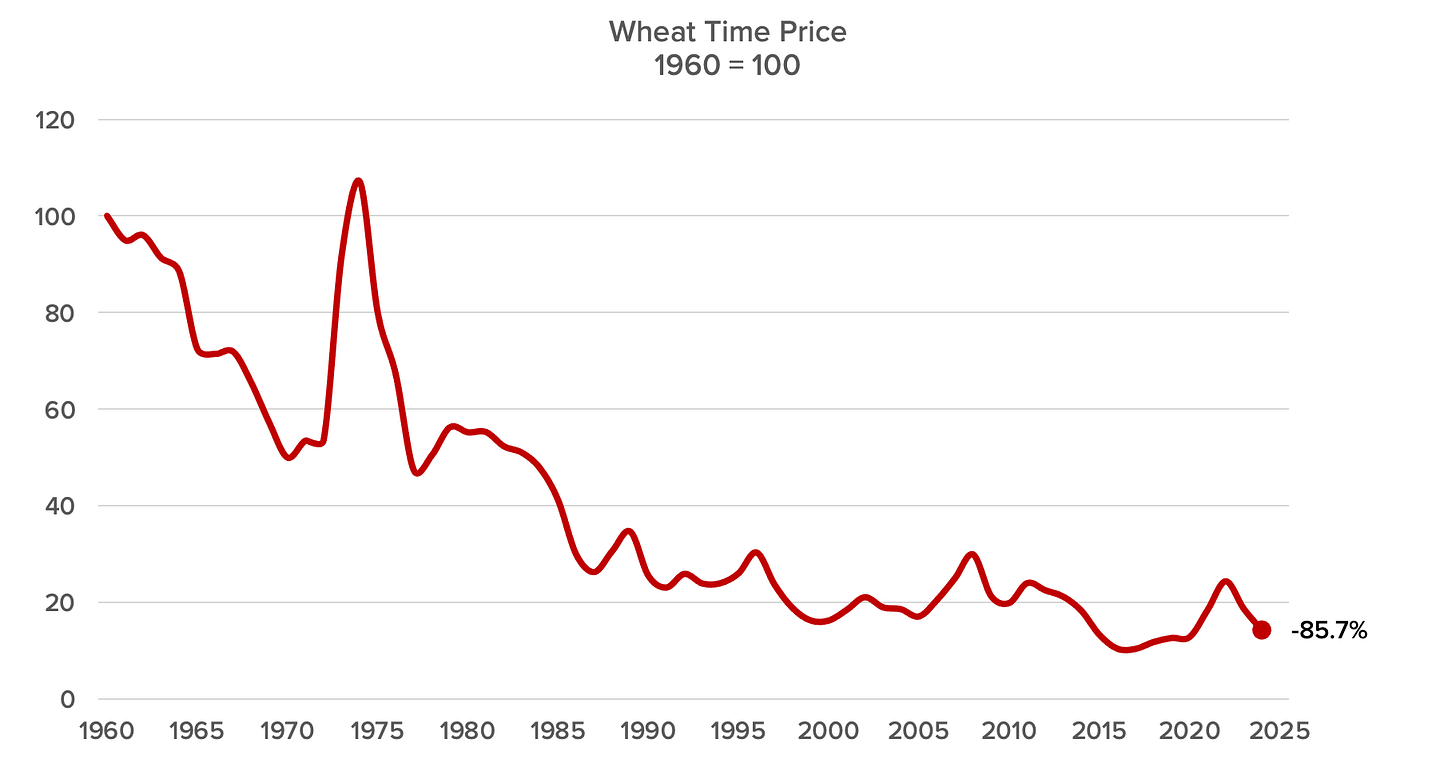 But what about the time price? Glad you asked. Since 1960, the time price of wheat has fallen by 85.7 percent.